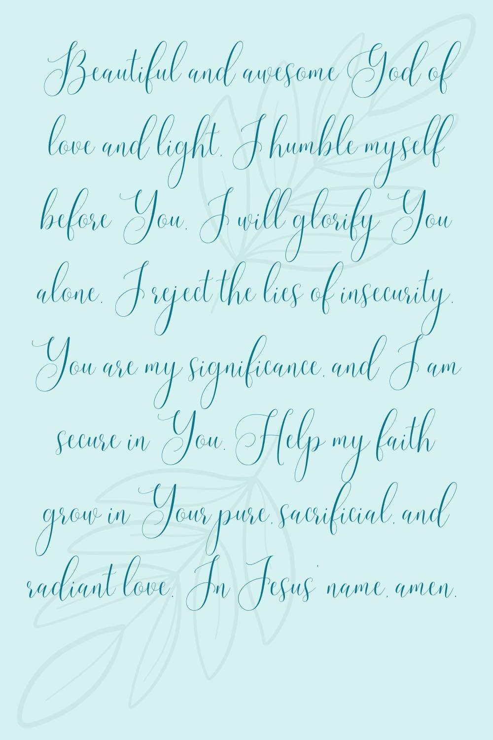 Pray: Beautiful and awesome God of love and light, I humble myself before You. I will glorify You alone. I reject the lies of insecurity. You are my significance, and I am secure in You. Help my faith grow in Your pure, sacrificial, and radiant love. In Jesus’ name, amen.